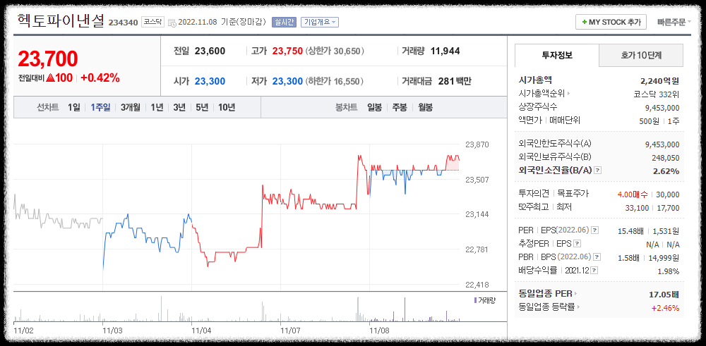 인포바인은 지능망 호스팅 전문업체로 소액결제, Vinepay, 휴대폰인증서 등의 사업을 하고 있습니다. 11월 7일부터 조금씩 오르더니 전날 대비 5.54%가 증가한 23,800원으로 마감되었습니다. 오늘 소개해드리는 주식 중 가장 많이 올랐습니다.