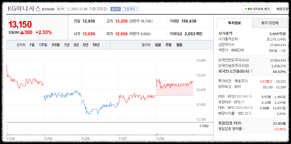 KG이니시스는 온라인 전자결제를 주요 사업으로 하고 있고 신용카드, 계좌이체, 에스크로, 문화, 도서 상품권 등 다양한 사업을 하고 있습니다. 전날 2.33%가 상승해 13,150원으로 기록했어요